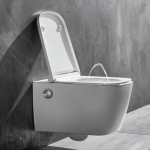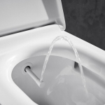 Подвесной безободковый унитаз со встроенным гигиеническим душем. Гигиенический душ функционирует без использования электричества, необходимо подключение к горячей и холодной воде.