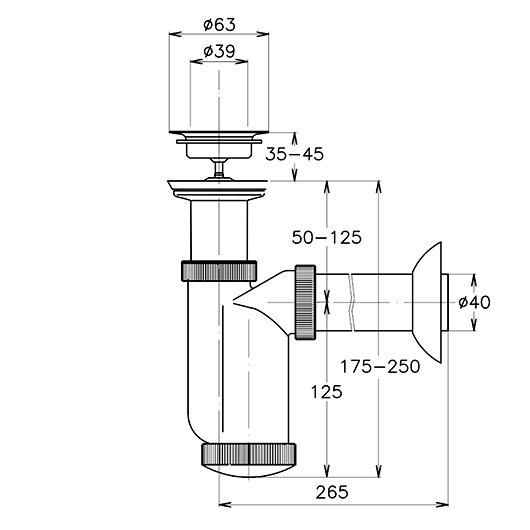 - В комплекте: пластиковая сливная решётка – 1 шт.; впускной патрубок – 1 шт.; крепёжный винт из нержавеющей стали – 1 шт.; корпус сифона – 1 шт.; ревизионная крышка – 1 шт.; обжимная гайка – 2 шт.; выпускной патрубок Ø40×220 мм – 1 шт.; уплотнительные кольца – 1 компл.; настенная декоративная розетка Ø85 мм – 1 шт.; паспорт изделия – 1 шт.